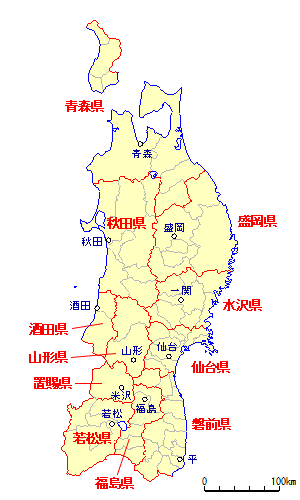青森県 ・ 盛岡県 ・ 水沢県 ・ 仙台県 ・ 秋田県 ・ 酒田県 山形県 ・ 置賜県 ・ 磐前県 ・ 福島県 ・ 若松県 |