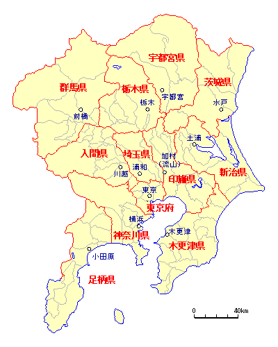 茨城県 ・ 新治県 ・ 宇都宮県 ・ 栃木県 ・ 群馬県 ・ 入間県 埼玉県 ・ 印旛県 ・ 木更津県 ・ 東京府 ・ 神奈川県 ・ 足柄県 |