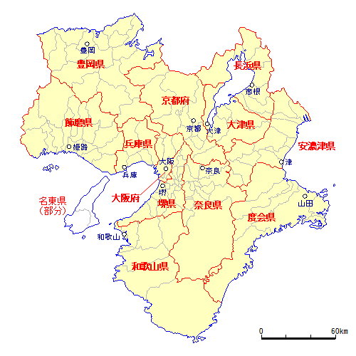 安濃津県 ・ 度会県 ・ 長浜県 ・ 大津県 ・ 京都府 ・ 大阪府 堺県 ・ 兵庫県 ・ 豊岡県 ・ 飾磨県 ・ 奈良県 ・ 和歌山県 名東県 |