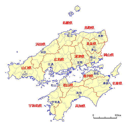 鳥取県 ・ 島根県 ・ 浜田県 ・ 北条県 ・ 岡山県 ・ 深津県 ・ 広島県 山口郡 ・ 名東県 ・ 香川県 ・ 松山県 ・ 宇和島県 ・高知県 |