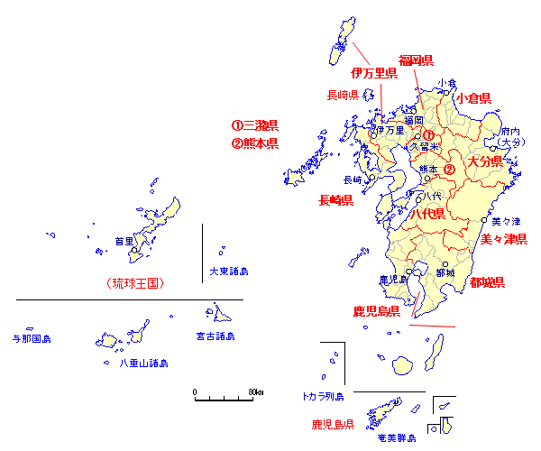 福岡県 ・ 小倉県 ・ 三潴県 ・伊万里県 ・ 長崎県 ・ 熊本県 八代県 ・ 大分県 ・ 美々津県 ・ 都城県 ・ 鹿児島県 |