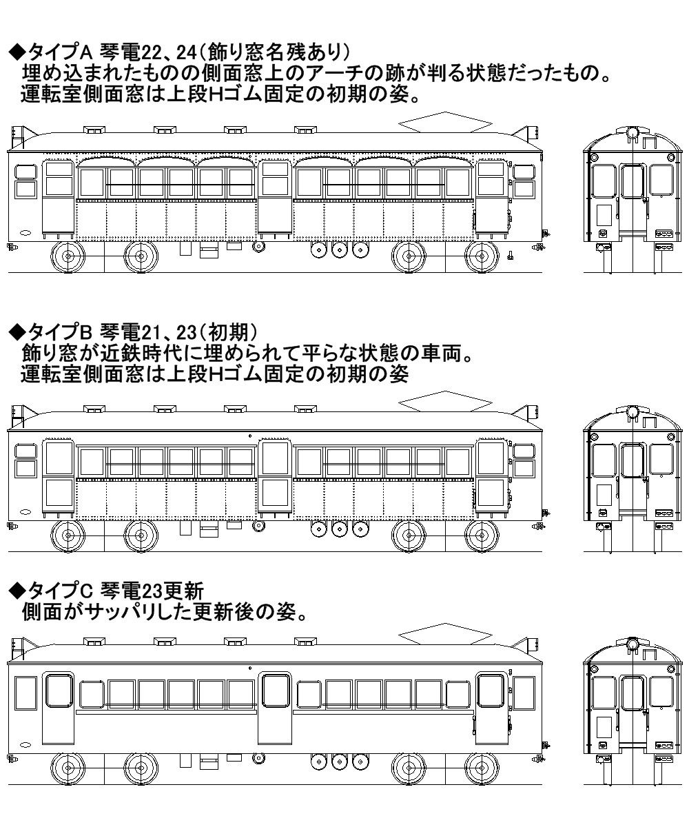 琴電への入線時、前面は5枚窓の丸妻から、3枚窓の平妻の貫通形に改造され、台車も交換されています。