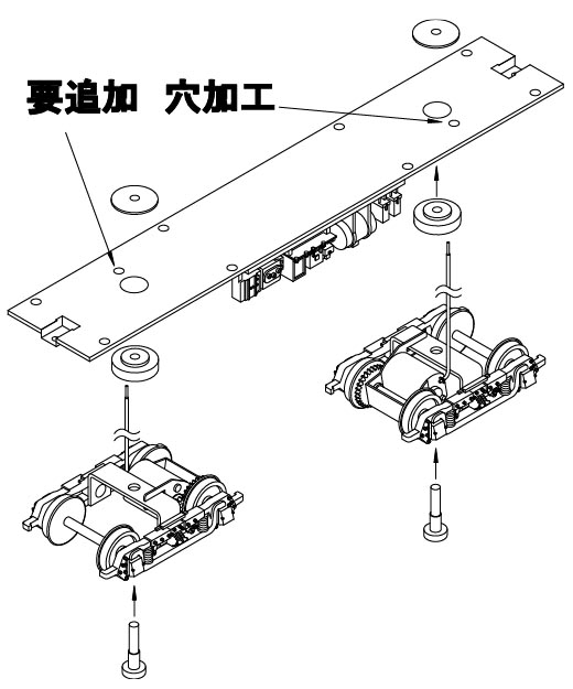 ステップ2:床板に、配線用の穴加工を行います。 市販のボルスターセットを利用して、床板に台車を取り付けます。