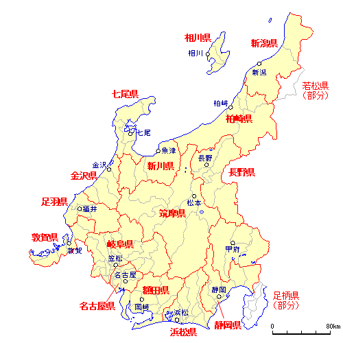 新潟県 ・ 柏崎県 ・ 相川県 ・ 新川県 ・ 七尾県 ・ 金沢県 ・ 足羽県 ・ 敦賀県 山梨県 ・ 長野県 ・ 筑摩県 ・ 岐阜県 ・ 静岡県 ・ 浜松県 ・ 額田県 ・ 名古屋県 若松県 ・ 足柄県 |