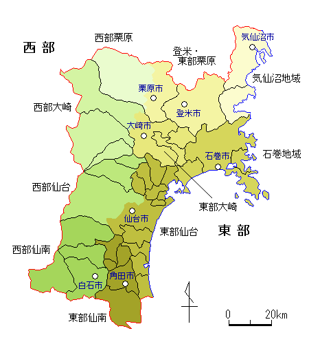 仙台市(泉区,青葉区宮城総合支所管内,太白区秋保総合支所管内),白石市,栗原市(一迫・鶯沢・栗駒・花山),大崎市(岩出山総合支所・鳴子総合支所管内) 刈田郡,柴田郡(川崎町),黒川郡(大和町:西部,大衡村),加美郡 |