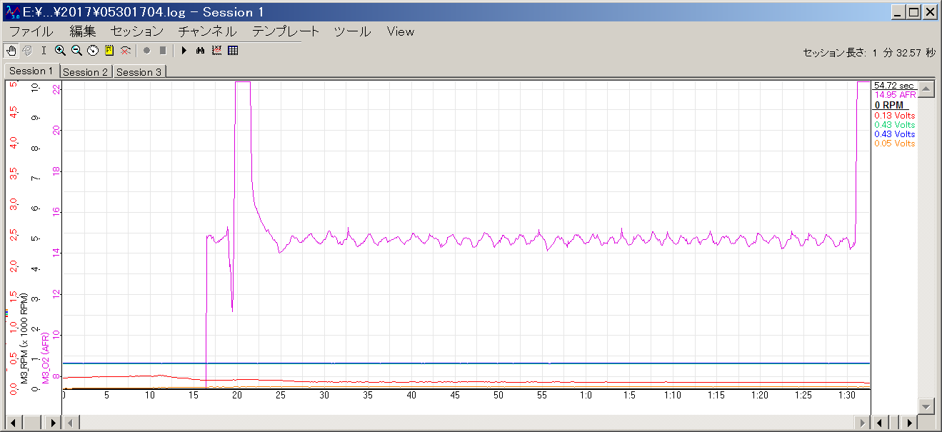 始動直後は目標空燃比(14.7)より大きく外れていても、一定の時間が経過するとA/Fの自動制御が始まり、14.7前後に治まる。(この時間は、始動時の動作環境(エンジン温度など)でことなる模様である)